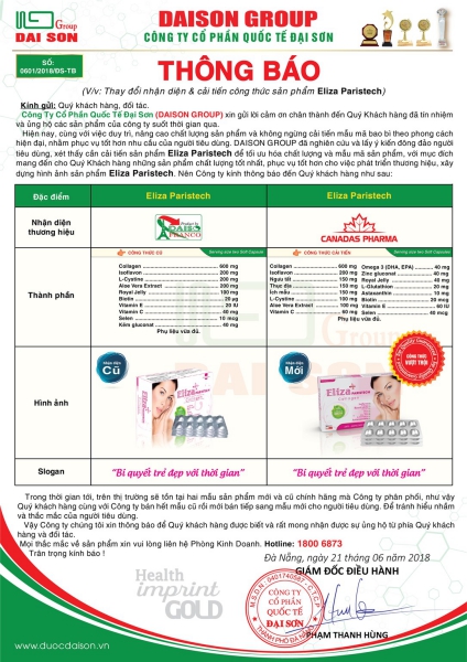 Hiện nay, cùng với việc duy trì nâng cao chất lượng sản phẩm, nhằm phục vụ tốt hơn nhu cầu của người tiêu dùng. Đại Sơn Group đã nghiên cứu và xét thấy cần cải tiến công thức sản phẩm Eliza Paristech để tối ưu hóa chất lượng và định vị thương hiệu sản phẩm, với mục đính mang đến cho Quý khách hàng những sản phẩm “CHẤT LƯỢNG - AN TOÀN - HIỆU QUẢ”, phục vụ tốt hơn cho việc phát triển thương hiệu và xây dựng hình ảnh sản phẩm. Nên Công ty kính thông báo đến Quý khách hàng và người tiêu dùng vê nội dung thay đổi của sản phẩm: