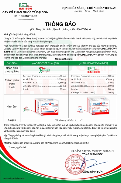 Hiện nay, cùng với việc duy trì và nâng cao chất lượng sản phẩm, nhằm phục vụ tốt hơn nhu cầu của người tiêu dùng. DAISON GROUP đã nghiên cứu và lấy ý kiến đông đảo người tiêu dùng, xét thấy cần cải tiến sản phẩm proDAISOVIT Extra. để tối ưu hóa chất lượng sản phẩm, với mục đính mang đến cho Quý khách hàng những sản phẩm tốt nhất, phục vụ tốt hơn cho việc phát triển thương hiệu và xây dựng hình ảnh sản phẩm. Nên Công ty kính thông báo đến Quý khách hàng một số nội dung thay đổi về sản phẩm: proDAISOVIT Extra.