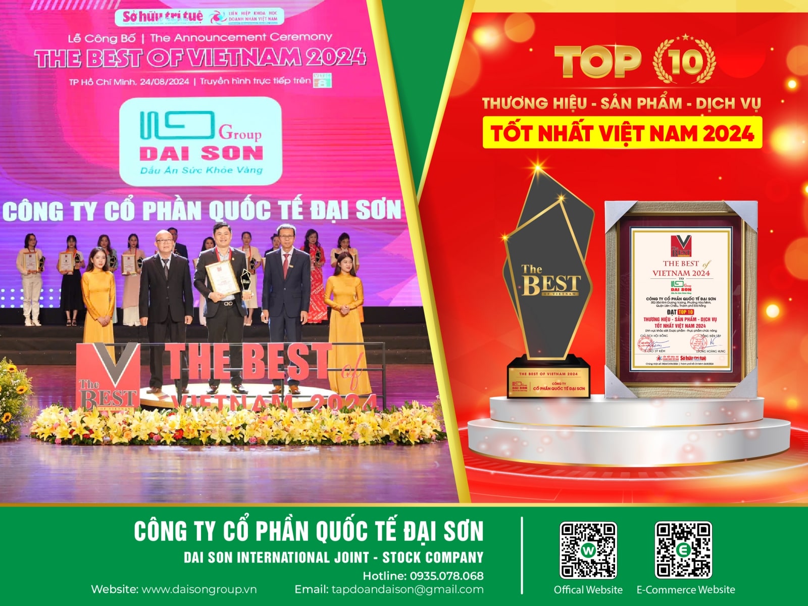 Ngày 24/8/2024 vừa qua, Công ty Cổ phần Quốc tế Đại Sơn (Đại Sơn Group) tự hào đón nhận danh hiệu “THE BEST OF VIETNAM 2024 (Thương hiệu - Sản phẩm - Dịch vụ Tốt nhất Việt Nam 2024)” tại Lễ trao thưởng tổ chức ở Nhà hát quân đội phía Nam, được truyền hình trực tiếp trên Đài truyền hình VTC8. Đây là giải thưởng danh giá từ bình chọn của người tiêu dùng cho các sản phẩm chất lượng, hiệu quả của các doanh nghiệp, do Hội Liên hiệp Khoa học Doanh nhân Việt Nam phối hợp với Tạp chí Sở hữu trí tuệ và Sáng tạo cùng các cơ quan Trung ương trao tặng.