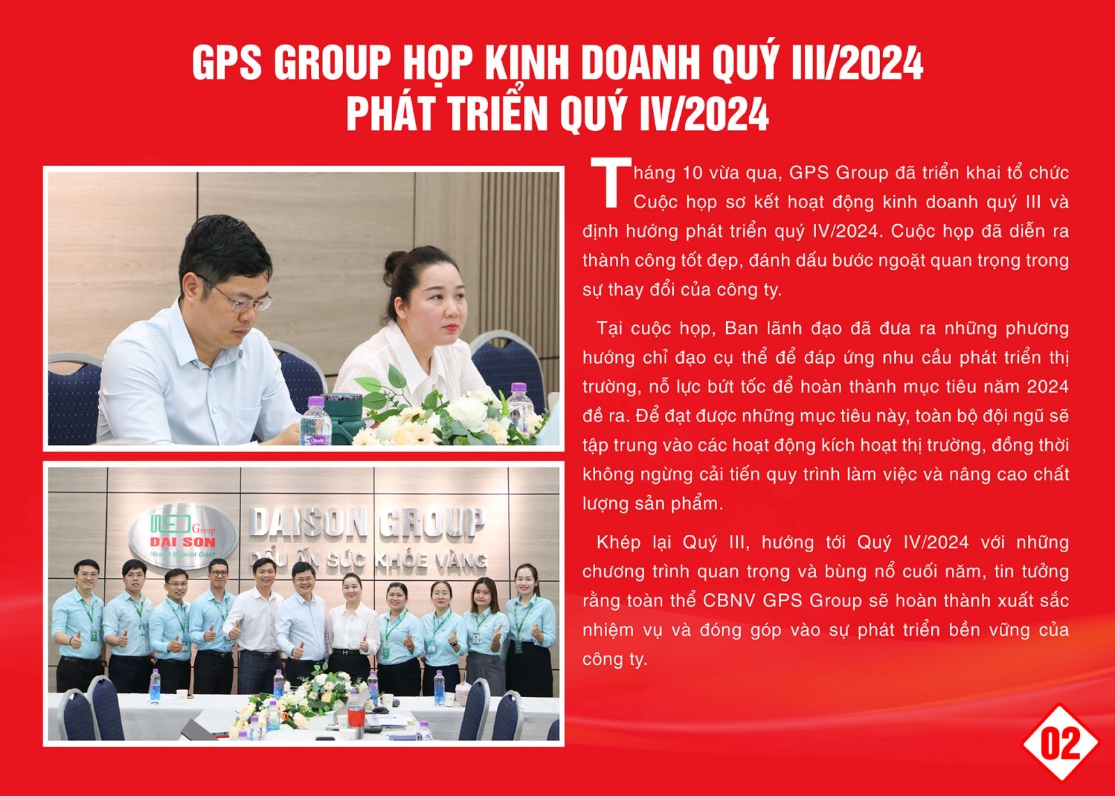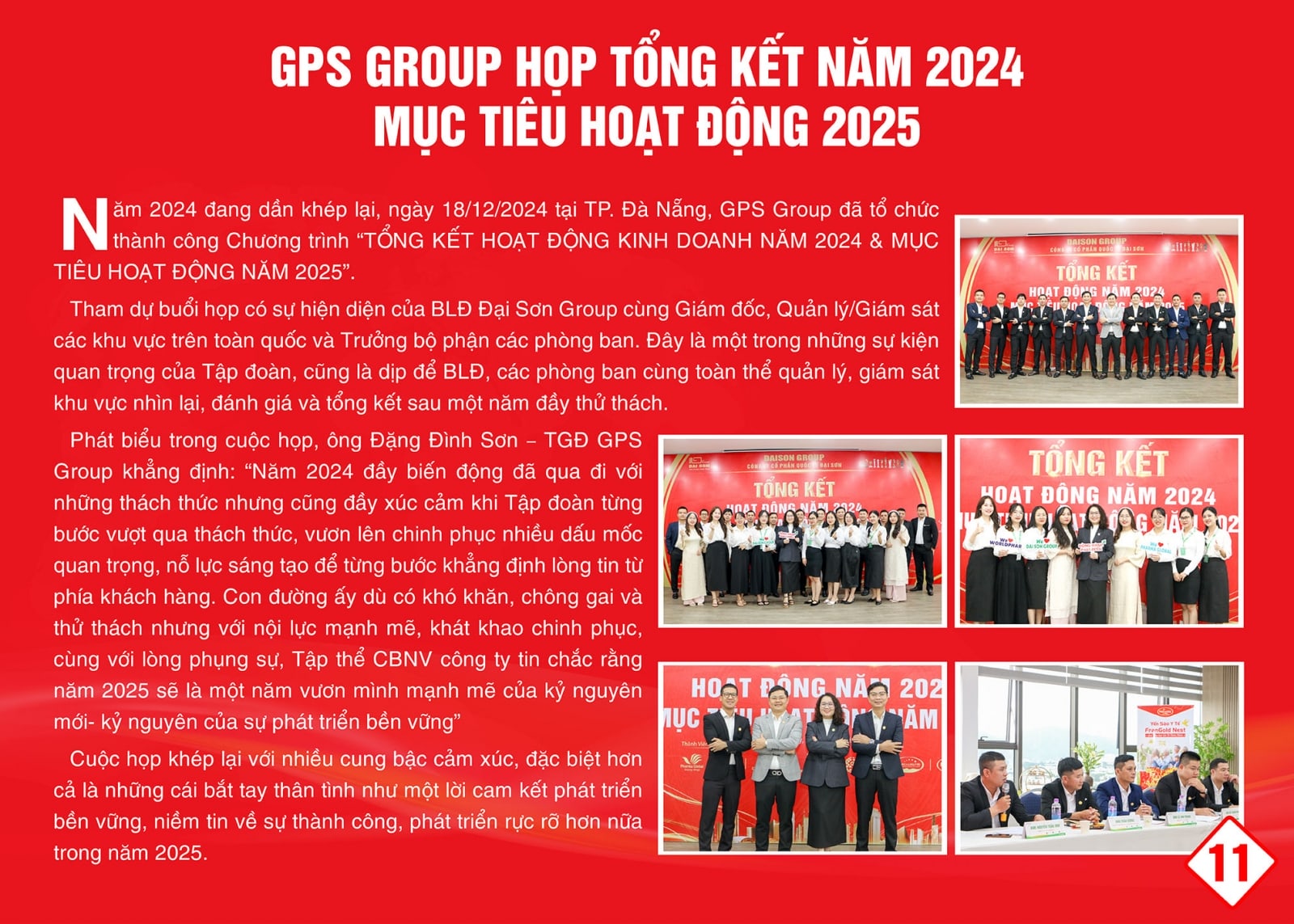 Vậy là năm 2024 đã khép lại, đánh dấu nhiều sự kiện quan trọng của GPS Group. Trong thời khắc kết thúc năm cũ, chúng ta cùng nhau nhìn lại những hoạt động của Tập đoàn, điểm lại những thành quả mà cả hệ thống chúng ta đã cùng nhau xây dựng – mà trong đó có một phần công sức và đóng góp của mỗi người. Để từ đó, mỗi thành công chính là dấu son ghi dấu sự trưởng thành, lớn mạnh của Tập đoàn.